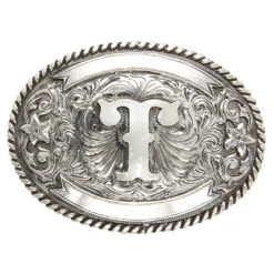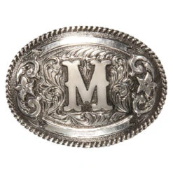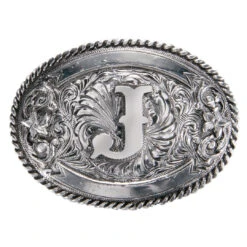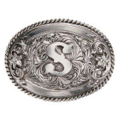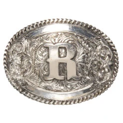 From AndWest, this is a medium antique silver, oval belt buckle with filigree and floral detail. It has an western style letter in the center and a twisted rope trim..