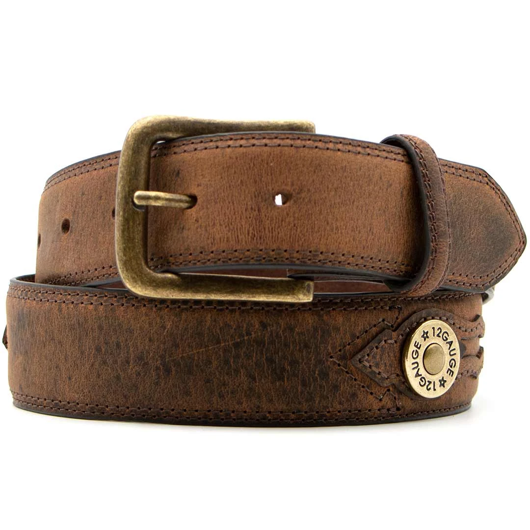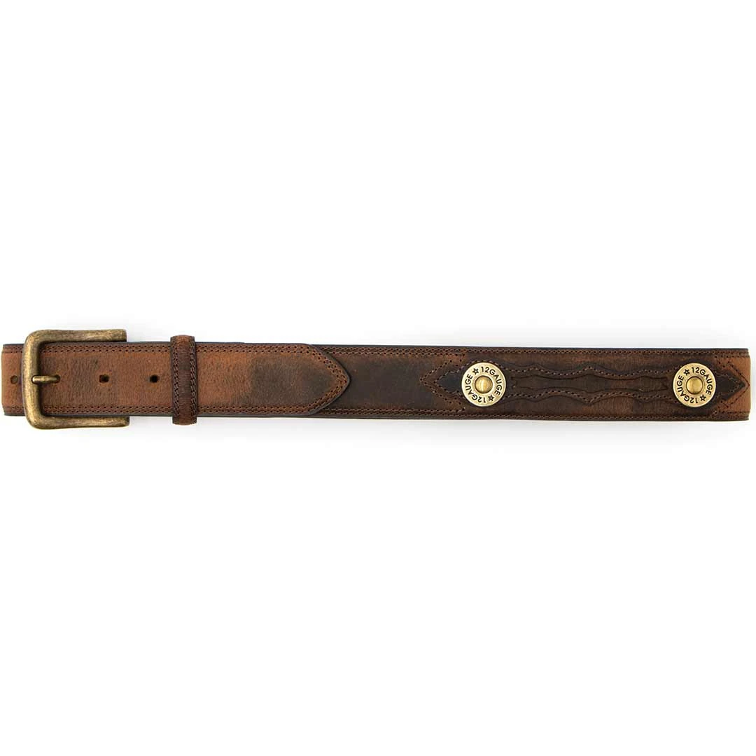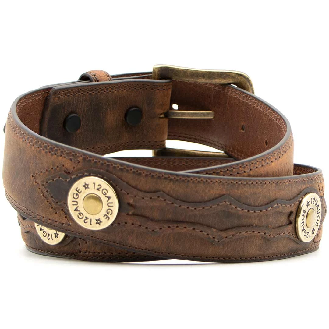 From And West, this belt set features an antique brass buckle, round 12 gauge concho overlays and snaps that allow you to change out the buckle with a distressed brown strap.