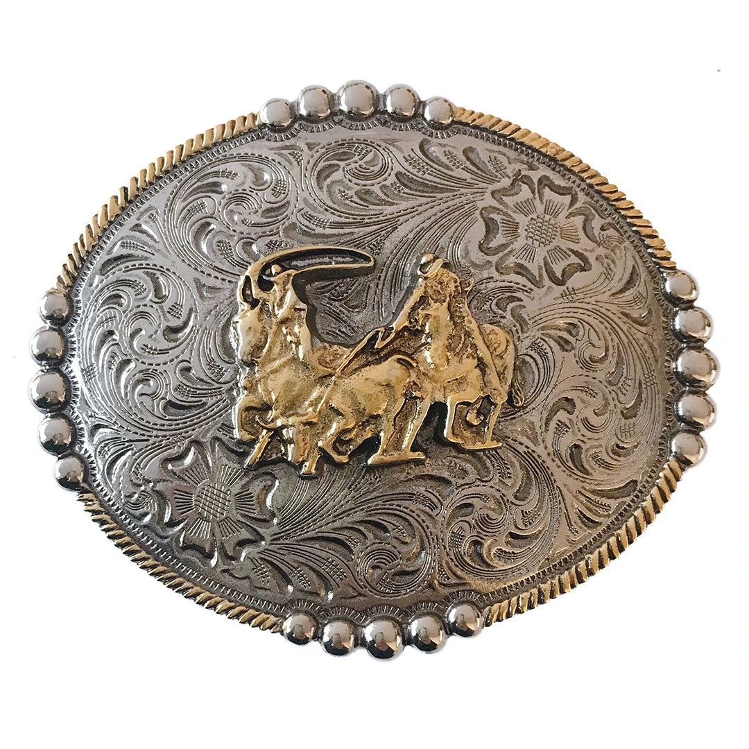 For the cowboy team roper this antique gold belt buckle from AndWest features team roping detail, berry and roped edge and filigree detail.