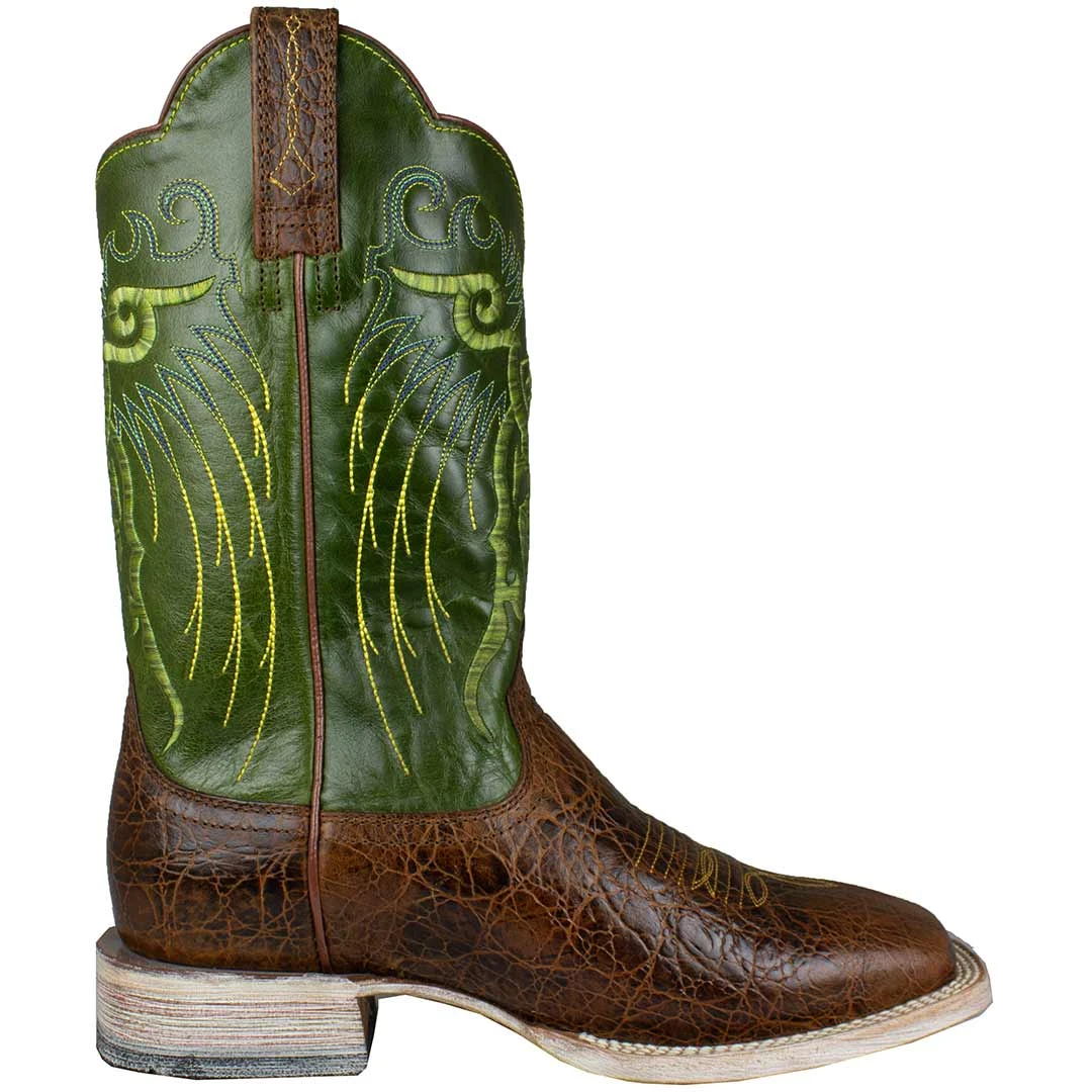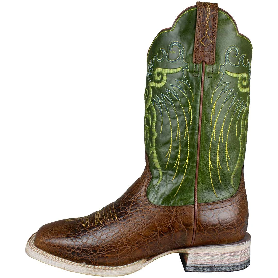 For the horseman who wants stand-out good looks matched with quality performance, the Mesteno Ariat cowboy boots are for you! Made with premium full gain leather, the adobe clay brown foot is paired with a lime green shaft featuring a detailed embroidery design. These men’s cowboy boots won’t let you down!
