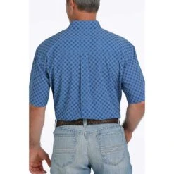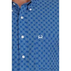 The ideal fit and breathability of this royal blue poly-spandex Arenaflex shirt from Cinch keeps you comfortable working overtime. Lightweight short-sleeved construction features a handsome geometric print, button down collar, open left front pocket with logo embroidery and cream buttons