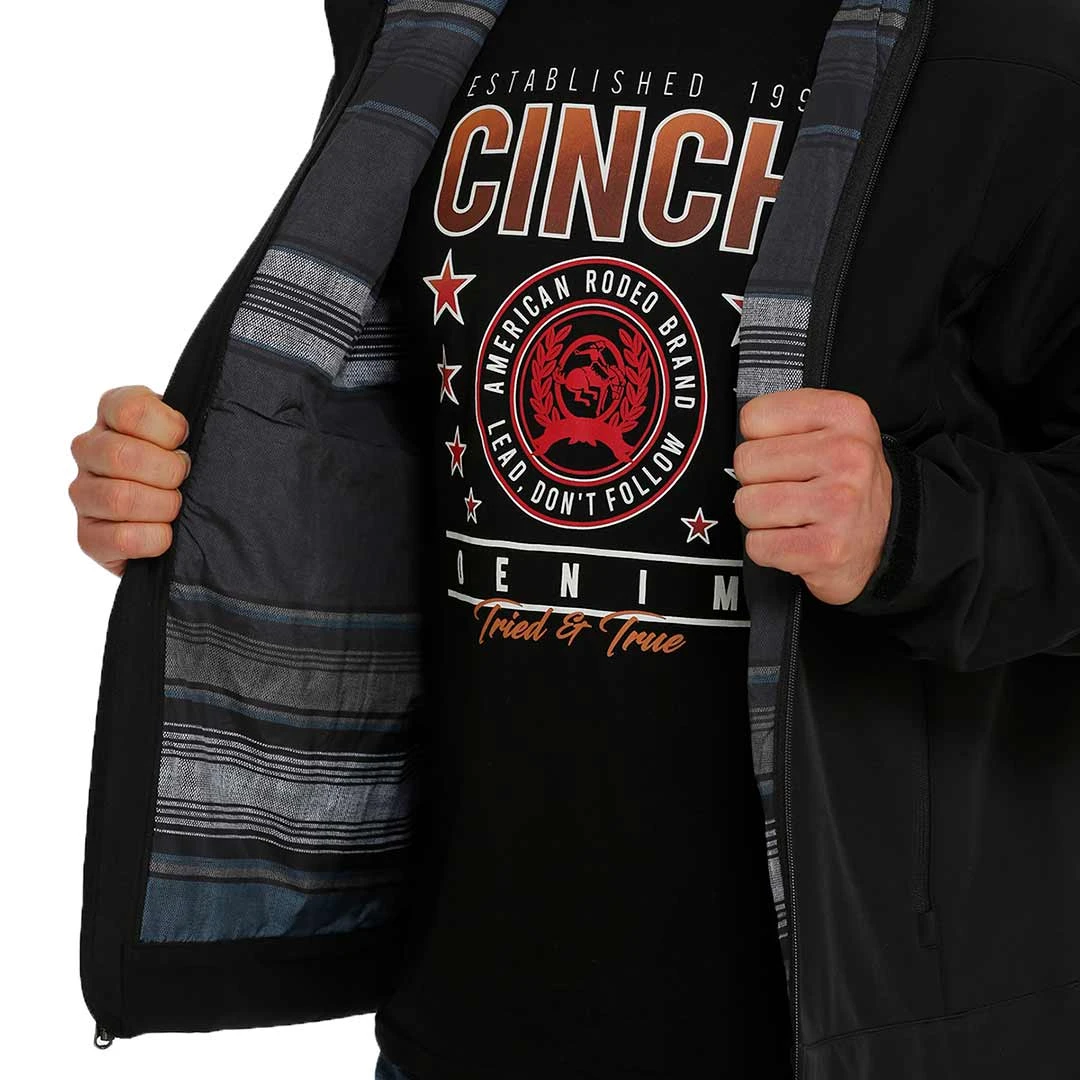 Fall weather calls for handsome outerwear options like this poly-spandex bonded jacket engineered with stylish poly blanket stripe lining. Providing good warmth for daily tasks and outdoor activities, this jacket features dual front zippered hand pockets, a vertical zippered chest pocket, 3D CINCH logo embroidery and Durable Weather Resistant finish.