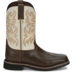 Rustic yet refined, the Driller Copper 11″ tall men’s work boot brings comfort and durability to the job. Its clean ivory leather upper is embellished by a retro-themed yellow, red, and green stitch pattern with a rich brown square toe foot. It has modern features that contribute to its functionality such as the J-Flex Flexible Comfort System insole that adds cushion and support and the Stampede rubber and EVA combination outsole with resistance to abrasion, chips, slipping, and marking which allows you to comfortably work on any surface.