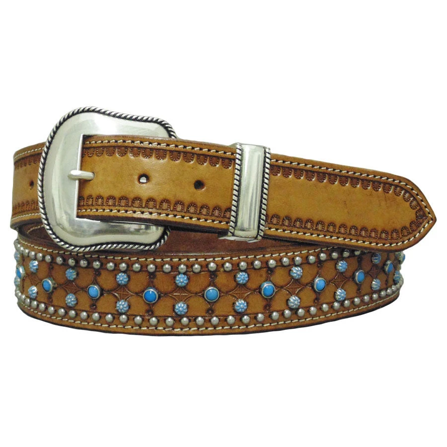 From Lejon’s Vintage Bison collection, this turquoise and stud design veg leather belt features detailed tooling, painted flat edge, bullet tip, contrast stitching and silver plated buckle and keeper.