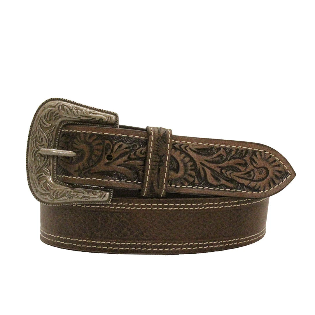 From MF Leather products, this custom leather belt features faux aged finish on the body of the strap, hand tooled western split billet in a complimentary tone, snap closure and an engraved western buckle in antiqued silver finish.