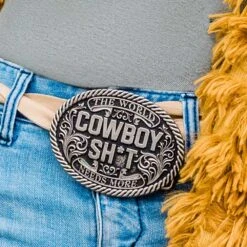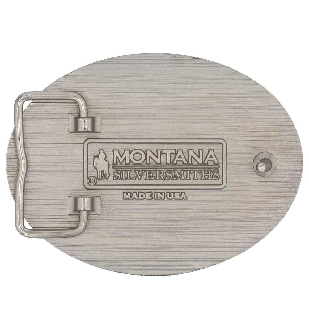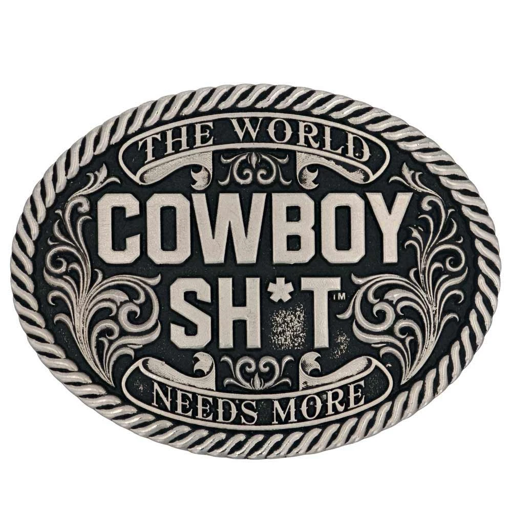 In collaboration with Ted Stovin and his company Cowboy Sh*t, Montana Silversmiths has created an Attitude buckle that holds one of the truest statements. It is oval-shaped and antique silver-toned with etched roped trim. In the center, the statement “The World Needs More Cowboy Sh*t” sits, surrounded by filigree and western banners. Standard 1.5 inch belt swivel.