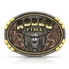 A two tone antiqued oval cast Attitude buckle from Montana Silversmiths features a large Bull Rider figure gold toned in the center with silver toned filigree and a double edge of microbeads of silver and gold tones. Standard 1.5 inch belt swivel.