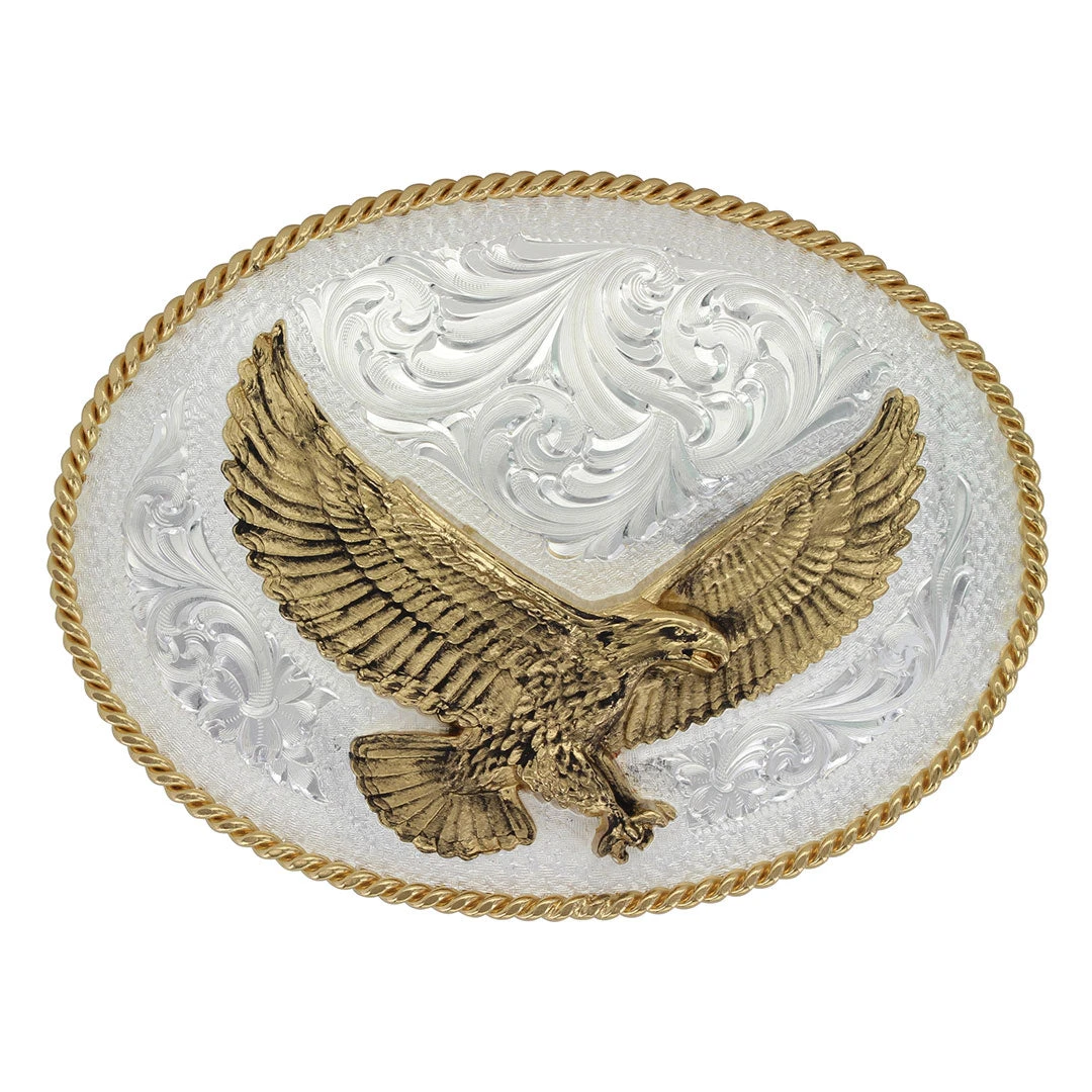 From Montana Silversmiths, this is an oval shape western belt buckle with a polished gold twisted rope trim. On the silver plate, a stippling frame borders the classic bright cut flower and feather filigree which is engraved to perfectly fit around the large gold eagle figure.