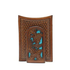 This Nocona Leather money clip wallet by M&F Western Products features a floral overlay on a red or blue background accentuated with a basket weave cover and a round floral concho.