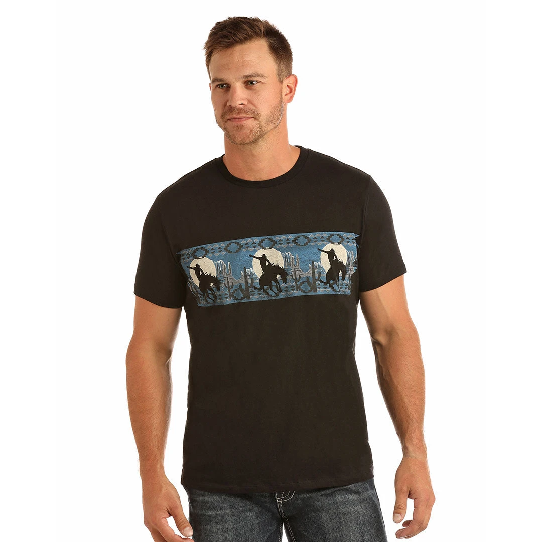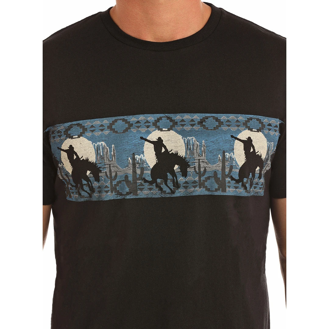 From Rock & Roll Cowboy, this classic black tee features a western border bronc rider graphic. Wear it alone or pair with a western shirt and you will be ready for a day of fun.