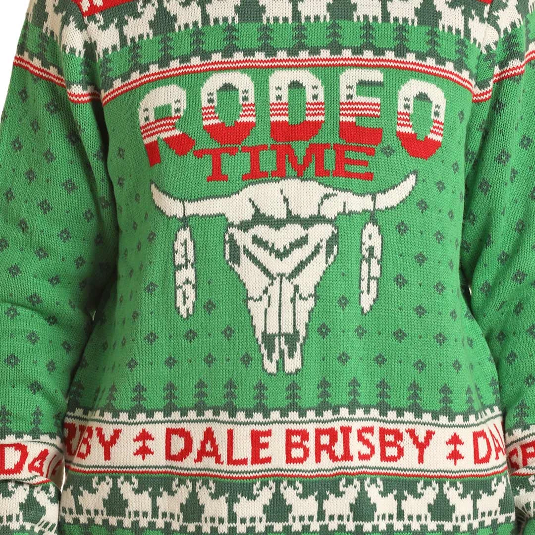 Celebrate the season with this Dale Brisby ugly Christmas sweater from Rock & Roll Cowboy. The sweater features a steer skull with a bull sweater pattern and red and white Rodeo Time lettering.