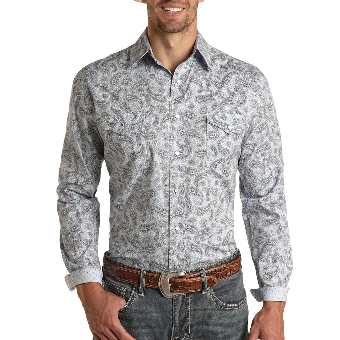 From Panhandleโs Rough Stock, this paisley print is just the ticket to a trendy look for the office or any evening plans you might have. The shirt features pointed yokes, pearl snaps and contrast fabric on the under cuffs.