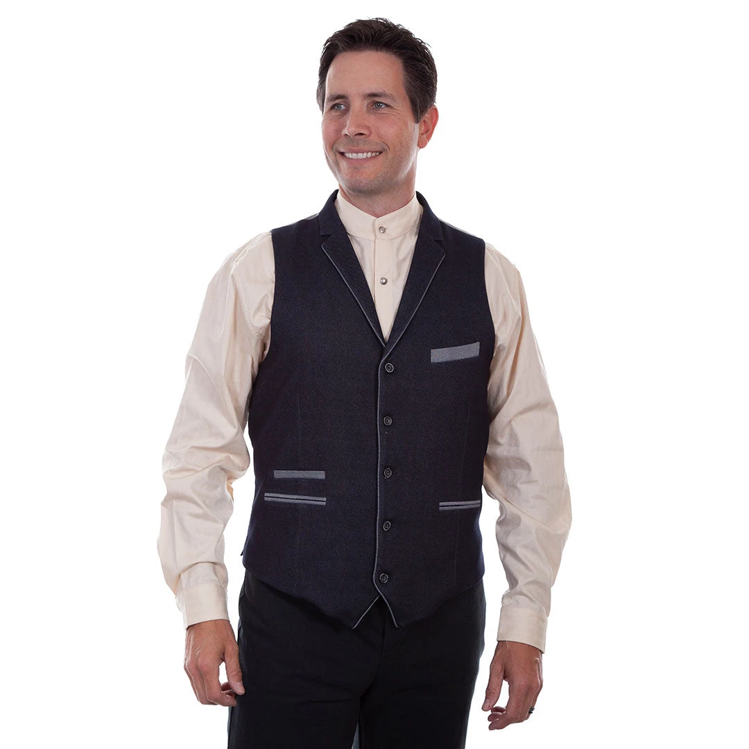 A solid four pocket point bottom vest. This authentic old west silhouette was refashioned and given new life. Here over 100 years ago bankers and shop keepers wore these vests; notice the watch pocket indicative of those times. from Scully this vest features small notched lapels, a five button front closure, a chest welt pocket, two self piping lower pockets and a watch pocket. Self piping down the front, which is the reverse side of the fabric.