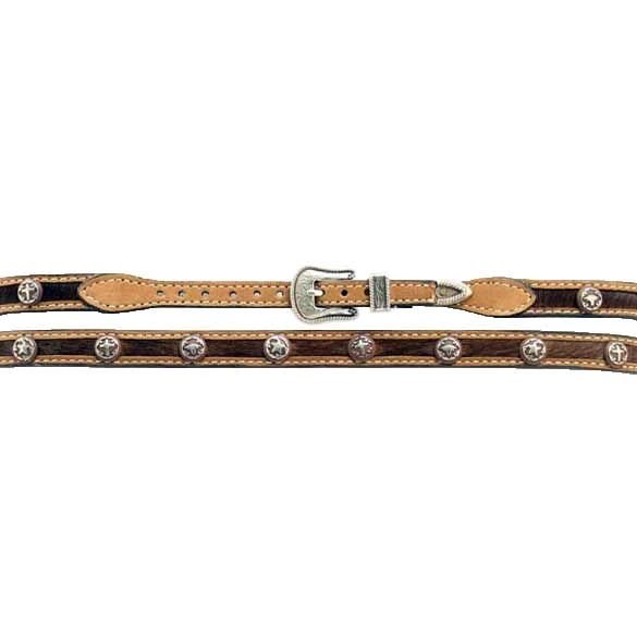 Create your own personalized hat style with this brown calf hair hatband by M&F Western Products. The silver conchos adds a touch of western flare that will definitely give you a very unique look. This style hatband uses a belt style adjustment with a rounded silver buckle.