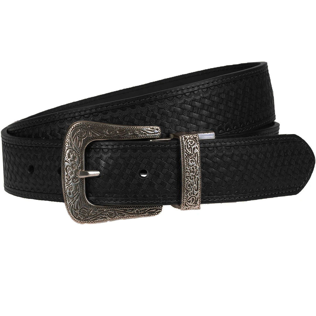 From Spirit Leather Works Wrangler collection, this leather belt features Western basketweave tooling and an antique silver engraved buckle and keeper set.