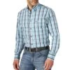 This is a menβs Authentic Cowboy Cut Work Western Shirt. It features authentic western front and back yokes and two authentic western spade flap snap pockets with snap closure. There is a Wrangler logo ribbon label on left pocket and a pencil slot at left pocket flap.
