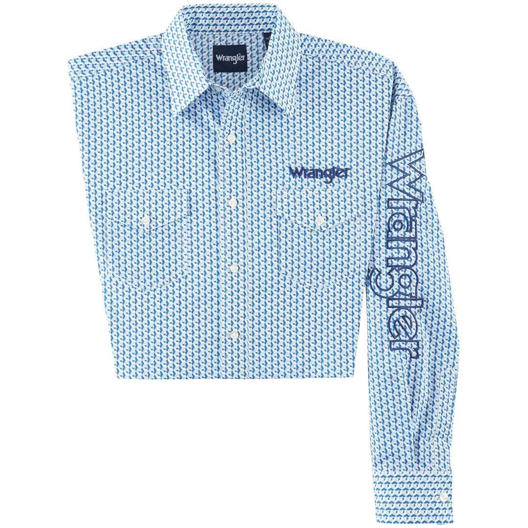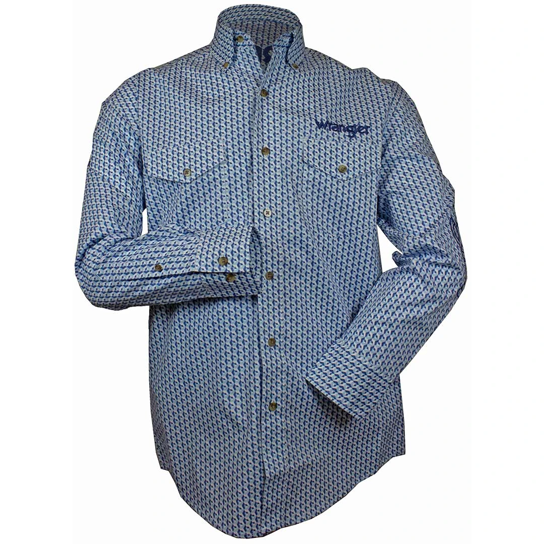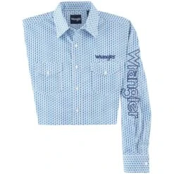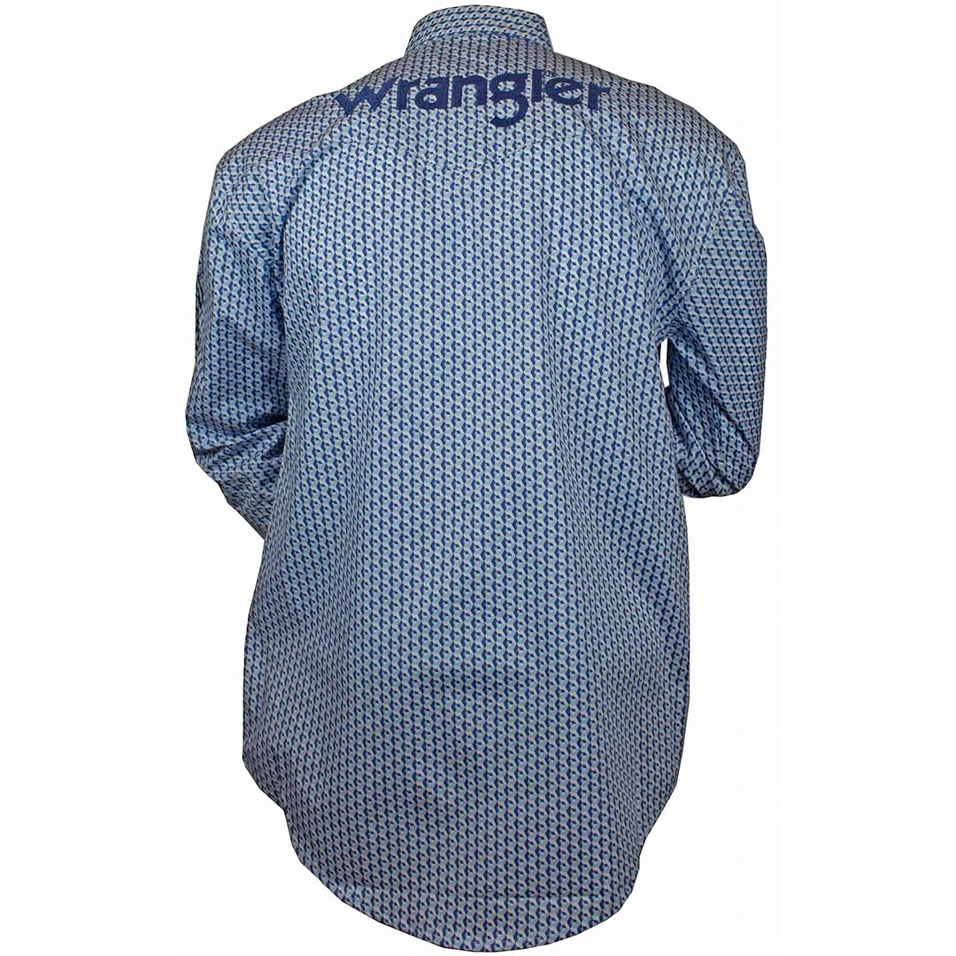 From Wrangler this geometric print long sleeve shirt features embroidered wrangler logo down the left sleeve, back yoke and above the right pocket. A spread collar, western back yoke and button flap front pockets cap off the impressive style.