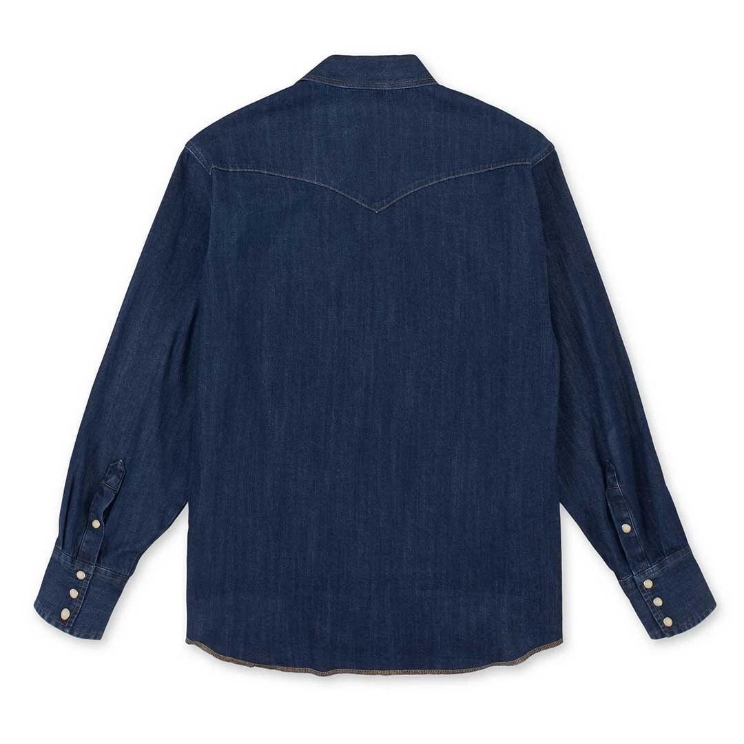 This is a men’s Western work shirt. It features authentic western front and back yokes and two flap snap pockets with snap closure. There is a Wrangler logo ribbon label on left pocket and a pencil slot at left pocket flap.